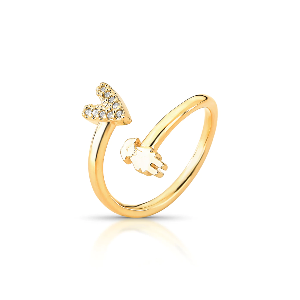 Anel com abertura frontal de menina e coração com microcravação de zircônias banhado em ouro 18k.