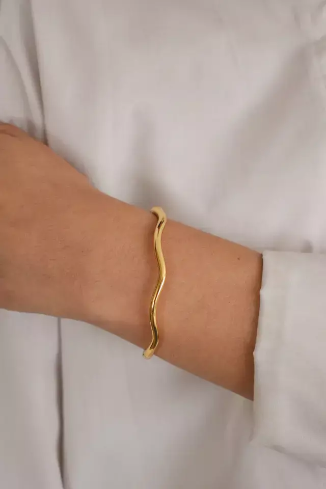 Bracelete orgânico com acabamento liso, fecho click e banhado em ouro 18k.