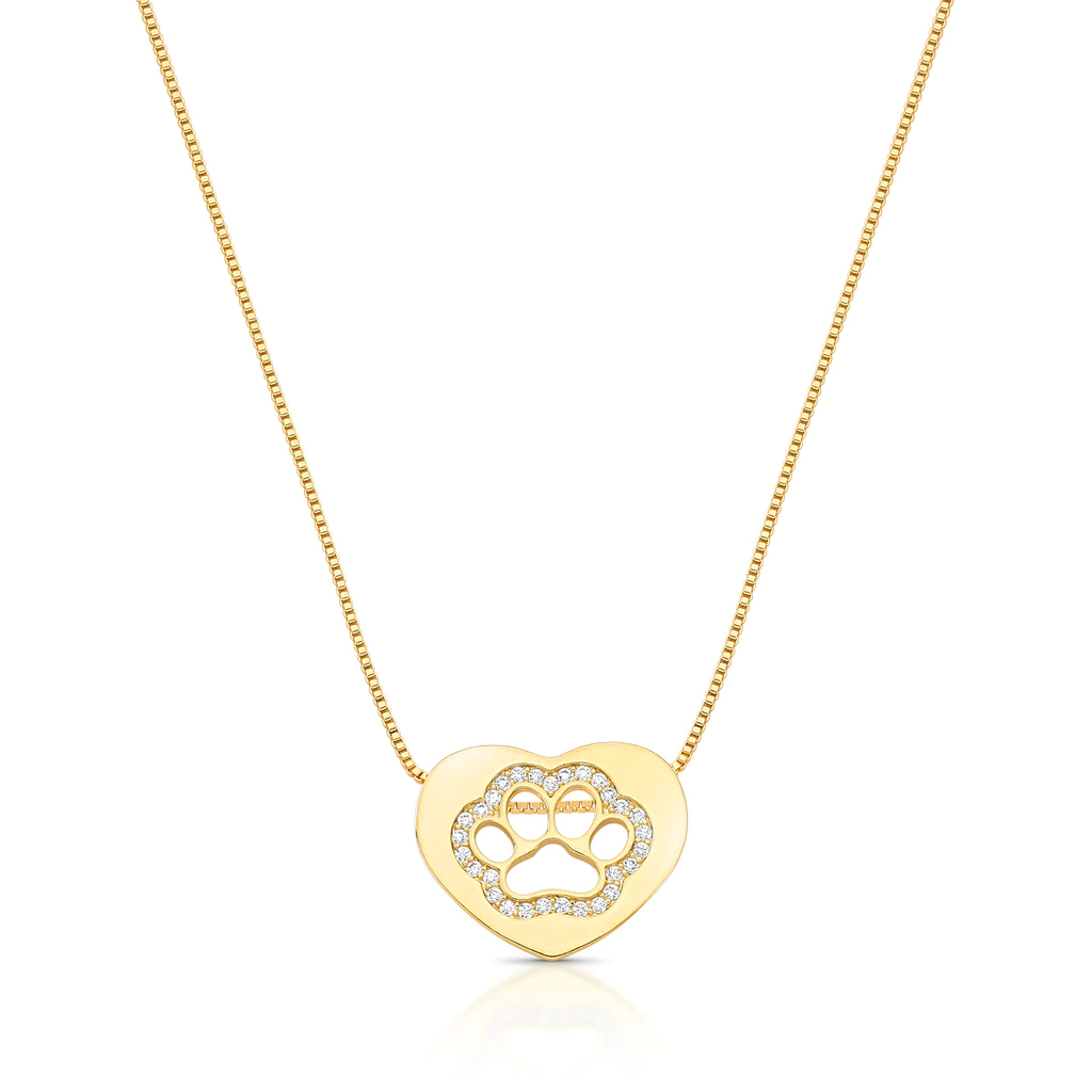 Corrente veneziana com pingente removível em formato de coração e recorte de patinha, detalhe cravejado em zircônias e banho em ouro 18k.